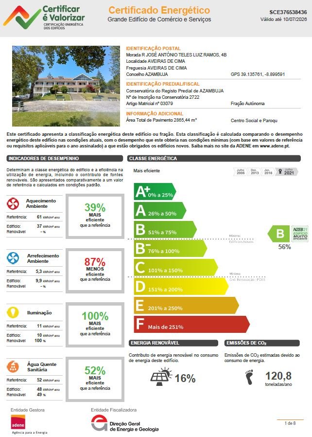 Certificação Energética Elaboração de Certificação Energética Ex-ante do Centro Social e Paroquial de Aveiras de Cima, para efeitos de candidatura para beneficiação e intervenção energética. Ver tamanho completo Ver tamanho completo Ver tamanho completo Ver tamanho completo Ver tamanho completo Ver tamanho completo